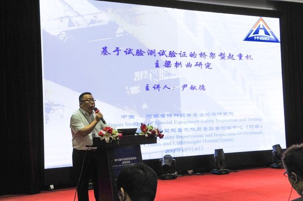 國家橋架類及輕小型起重機械質(zhì)量監(jiān)督檢驗中心主任尹獻德作《基于試驗測試的橋架型起重機主梁拱曲研究》主題報告